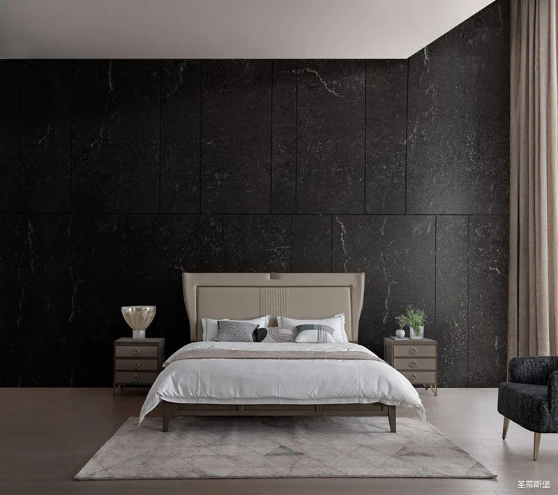 次卧床头背景沿用了暗色大理石护墙,空间层次分明,简约时尚的米色床屏糅合金属镶嵌与真皮编织艺术,看似舒适随意,却在极简中透着淡淡的奢华感。大面积的落地窗让自然光倾入室内,拉上与床屏同色系的窗帘,令次卧的室内空间明暗有度。