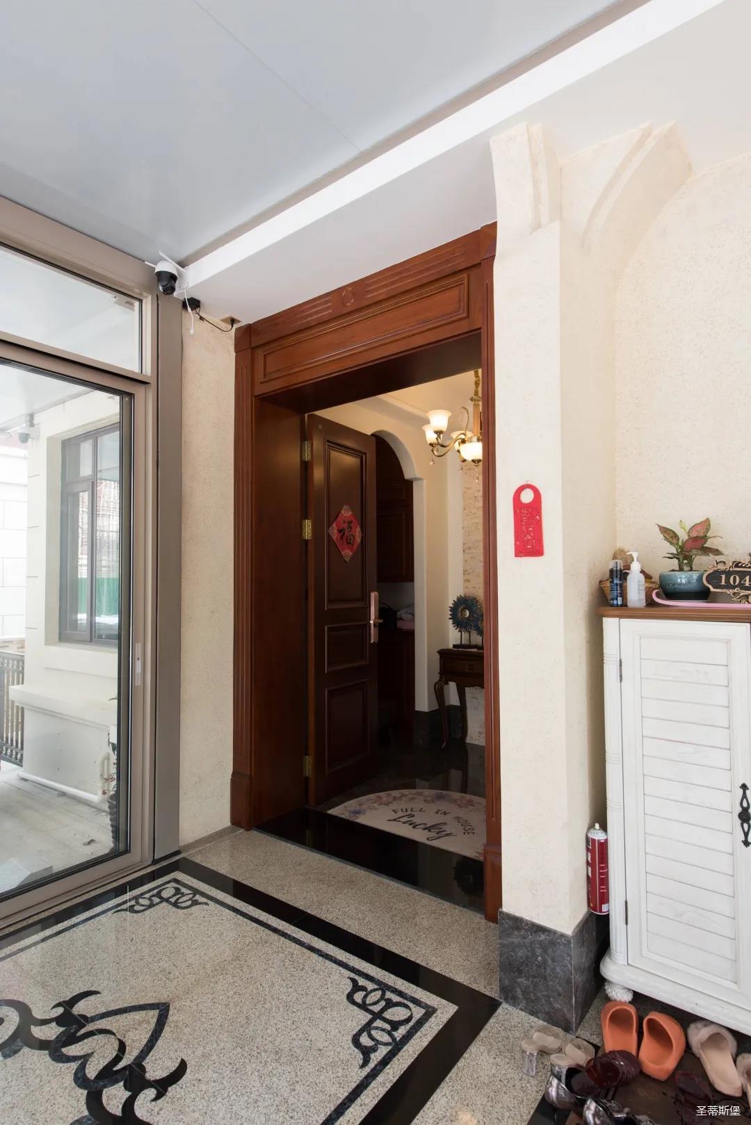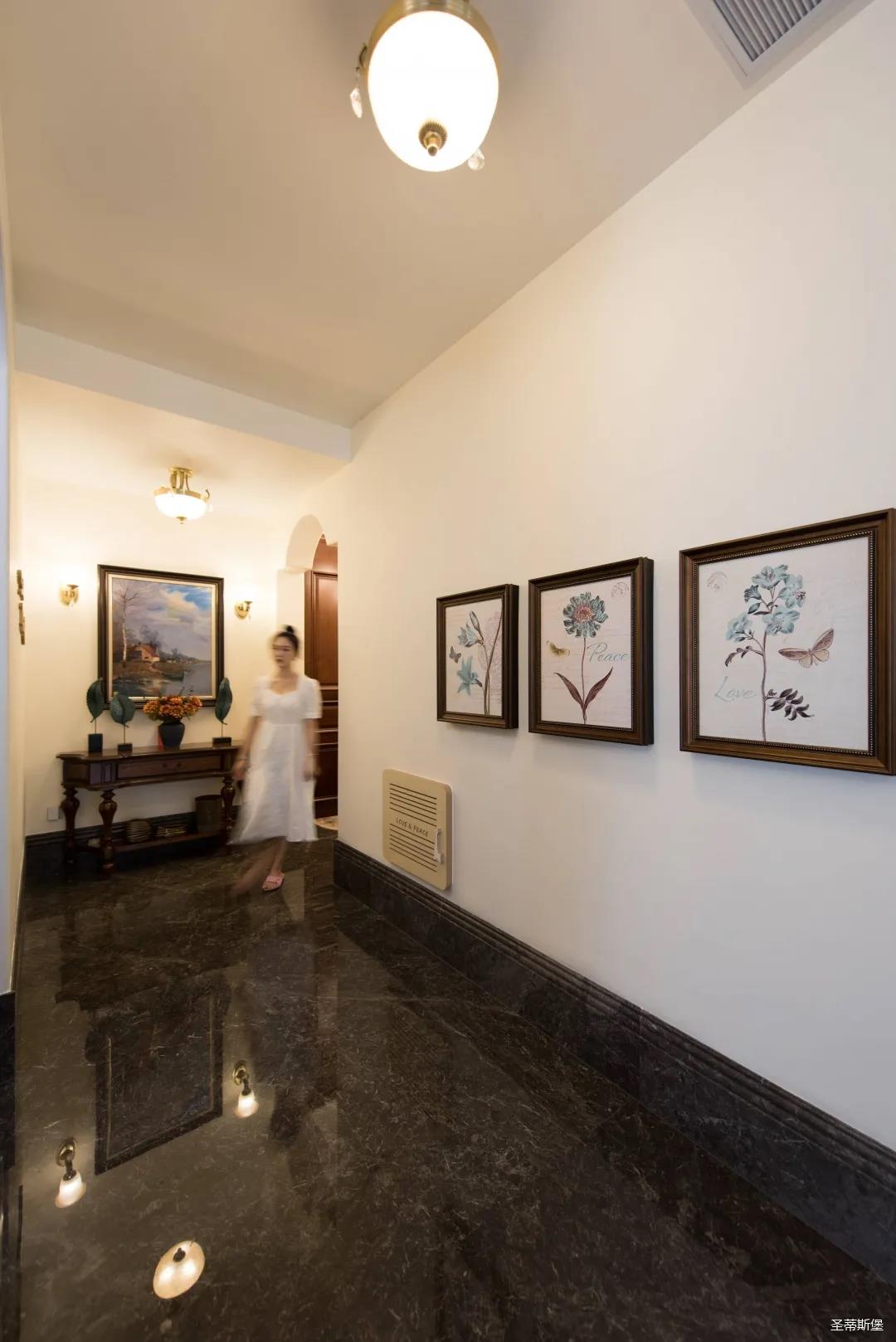入户玄关双开门设计,仪式感满满!地面定制的瓷砖贴花设计,典雅又大方。核桃实木玄关桌,加上精致的摆件,经典美式复古吊灯,不着痕迹的展现出居者对生活的激情,魅力吸睛,从入户开始感受古典氛围。