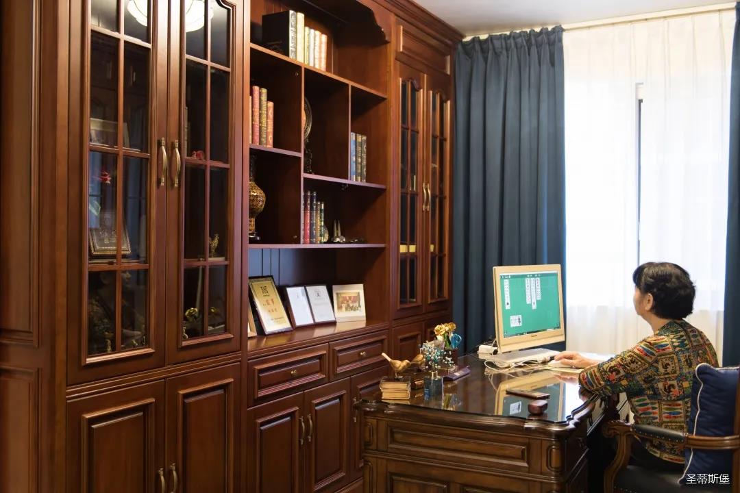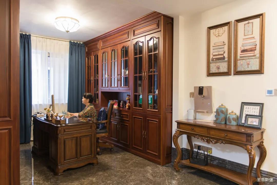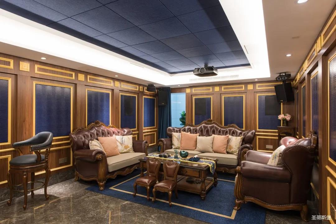 业主夫妇非常热情好客,平时工作之余也会在家里邀三两好友一起观影,观影室的整体设计容纳着浓烈的古色古香,长方形图案排列搭配复古的家具与配饰,精细的雕花艺术,于细节之间演绎着精致生活。不管时光如何辗转变换,家的定义从不曾改变,它抚慰着我们的心灵,承载着我们的喜乐,从细腻的质感中感知家的点滴变化,才是对生活最真实的写照。