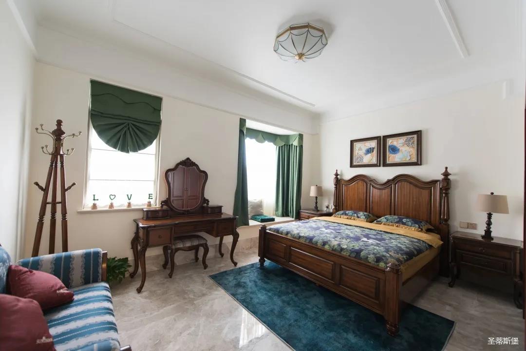 三楼是两间卧房,每一间卧室都有自己的特定属性。主人房端庄优雅,雍容尽显;墙面以简洁的美式石膏线修饰,波浪形的实木床屏上点缀着太阳形状的手工雕花,宛如海平面上刚出升的太阳,让整个空间色彩奔放。